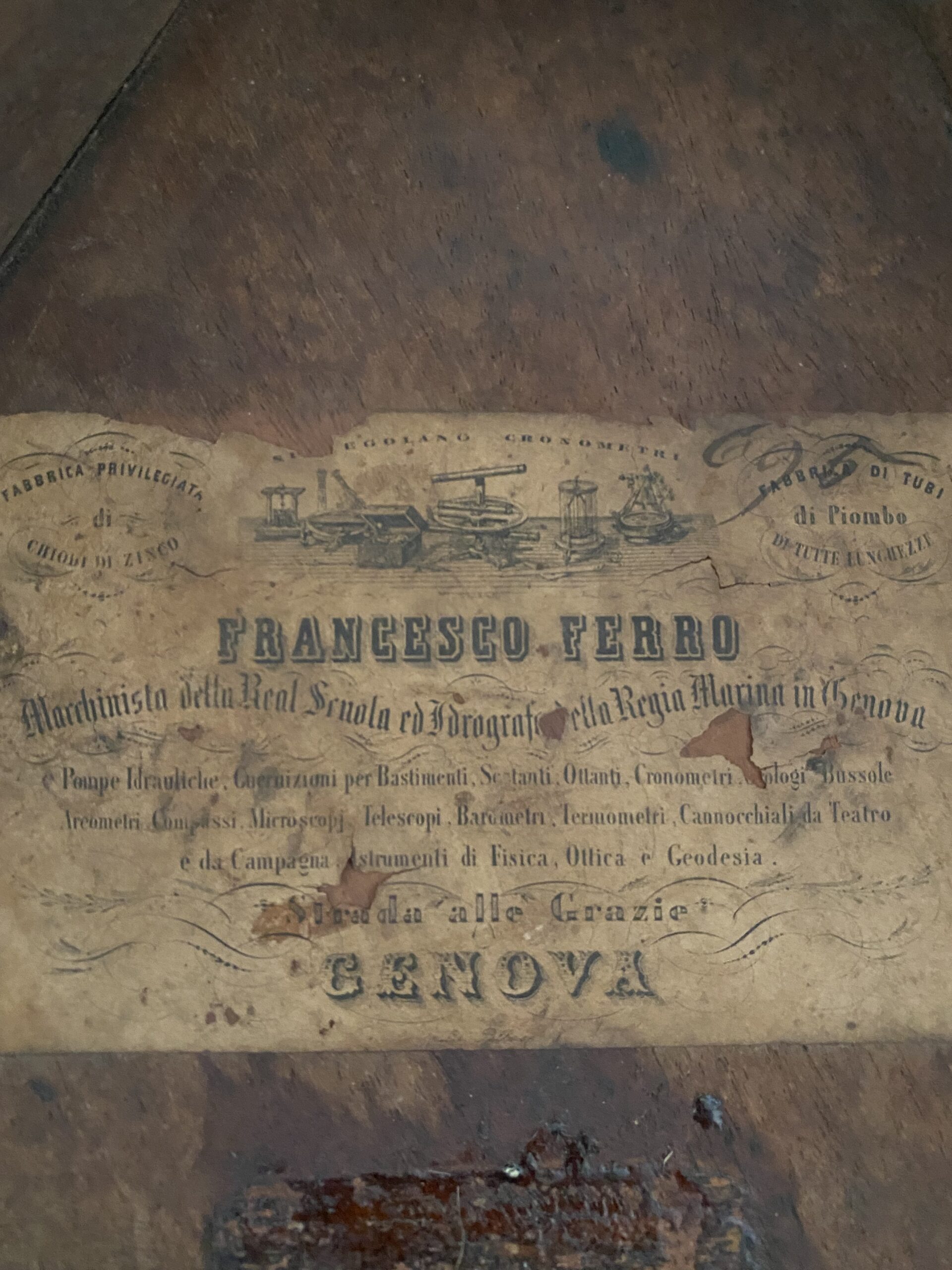Caja de caoba perteneciente a un sextante /octante de un distribuidor ( fabricante ) de instrumentos náuticos Italiano.